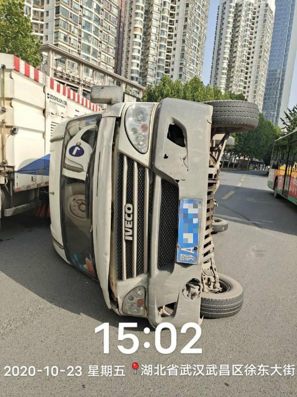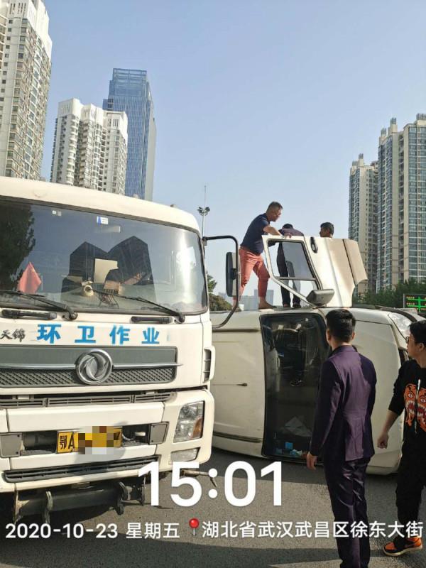 楚天都市报讯(记者卢成汉 通讯员高嫣嫕)“哎呀,翻车了!”10月23日,一辆中型面包车侧翻在徐东大街,正在作业的武昌环卫司机李俊停车将被困人员救出。