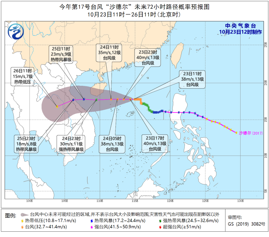 预计,“沙德尔”将以每小时15公里左右的速度向偏西方向移动,24日强度明显减弱,并将于24日傍晚到夜间擦过海南岛南部后,趋向越南中北部沿海。