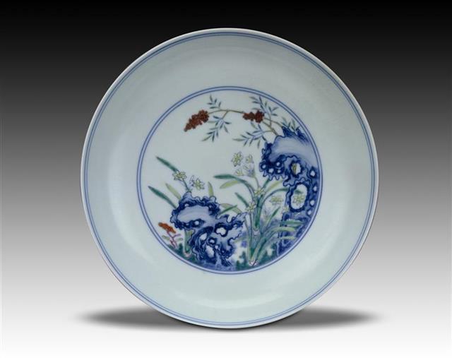 一件清代雍正年间的“斗彩芝仙祝寿图盘”,纹饰疏密有致,色彩鲜艳,顽石点缀其间,既显出水仙的清高,又突出灵芝的玲珑。整件器物构图优雅精致,给人恬静舒适之感,具有强烈的艺术感染力。裴少菲介绍,“水仙和灵芝都是吉祥纹饰,在清代瓷器上十分常见,寓意福寿绵绵。”
