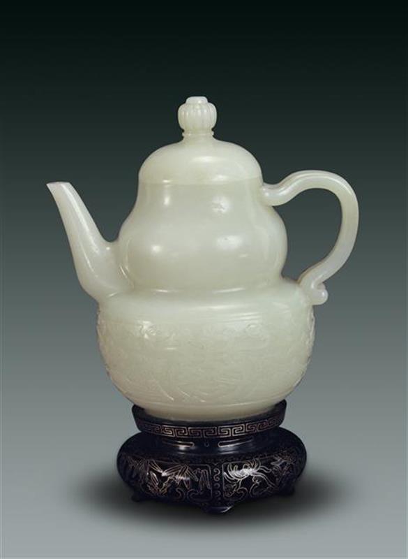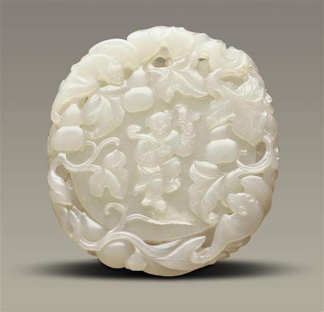 一件馆藏清代“白玉福寿纹葫芦形壶”,以整块和田白玉雕琢而成,金丝红木底座将葫芦形玉壶衬托得更为高洁典雅。玉壶腹部雕刻着福山云海和蝙蝠图案,这种题材被称为“流云百福(蝠)”,是我国传统吉祥纹饰,壶下腹两侧有浮雕篆书“寿”字。整体纹饰寓意福寿双全、长寿安康。另一件清代“益寿婴戏纹玉佩”,质地冰洁,雕刻着嬉戏的童子、葫芦、蝙蝠、万年青、缠枝纹等,寓意子孙万代、福寿双全。