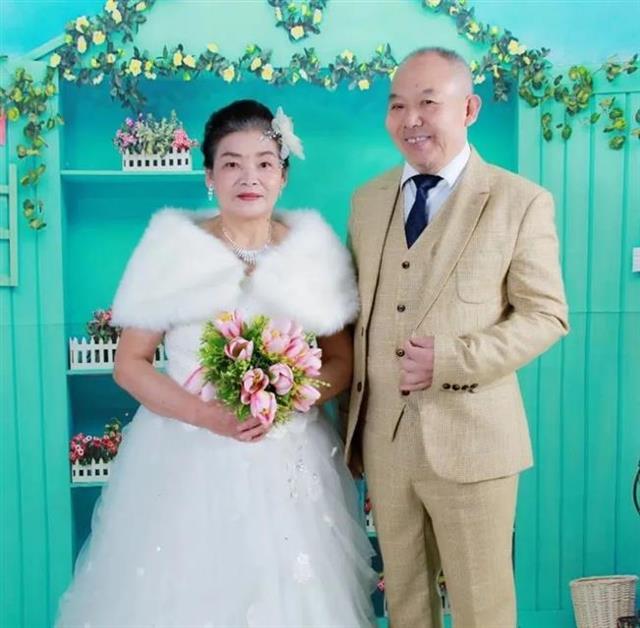 今早7点不到,64岁的蒋晶婆婆便叫醒了老伴,想到要拍婚纱照,“几乎一晚上都兴奋得没睡踏实”。在社区服务中心,她涂上口红、眼影,穿上婚纱走进摄影棚,与丈夫姚利华拍下了婚纱照。今年是二人步入婚姻殿堂的第40个年头。