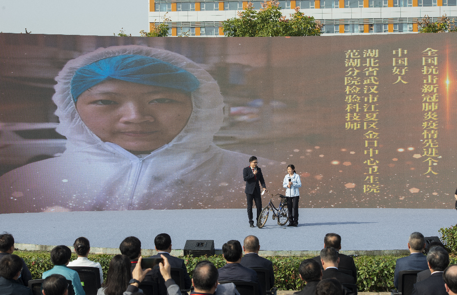 武汉市江夏区金口中心卫生院医生甘如意推着逆行回汉的自行车走上颁奖台。