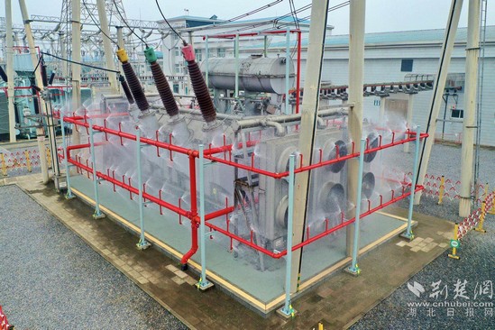 荆楚网客户端—荆楚网消息(通讯员 朱明忠)10月28日,在湖北鄂州220千伏郎家畈变电站,在模拟2号主变压器发生火灾隐患后,新安装的水喷淋系统立即启动,环绕着主变压器的100余个喷头喷射强劲水雾,迅速扑灭电力设备火灾。