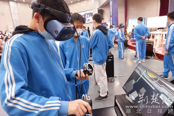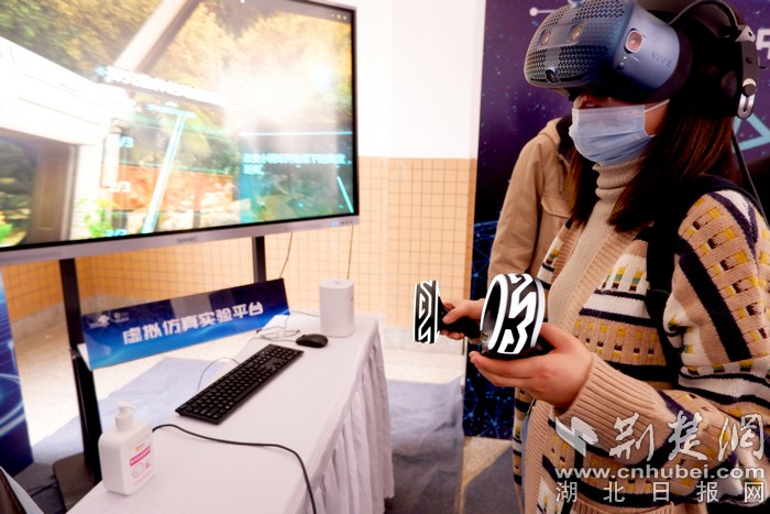 在会场外的虚拟仿真实验平台,襄阳市第四十二中学的物理教师荣赤舟正在体验:“这是我第一次使用VR仿真实验平台,刚刚练习的是‘探究物体的动能跟哪些因素有关’的实验。平时我们的实验室没有这么全的器材,有时只能教师在上面演示,学生来观看。这些设备能够确保每个学生都亲手做到实验,对实验结论的理解和基础知识的落实效果一定会更好。”