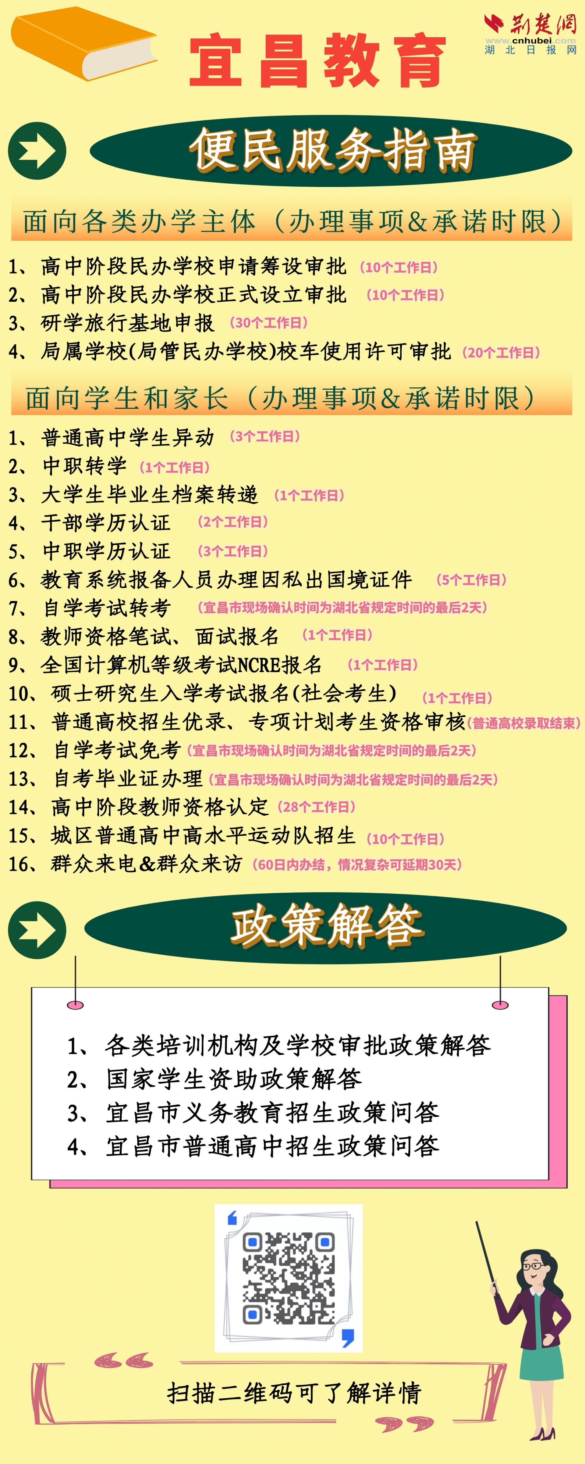 荆楚网客户端—荆楚网消息(记者 章巧慧 通讯员 张黎磊)10月30日,宜昌市教育局正式发布《宜昌教育便民服务指南》(简称《指南》),涉及办学审批、学历认证、入学转学等21个服务事项和国家学生资助等4个政策解答,旨在提升服务效能,打通教育便民服务“最后一公里”。