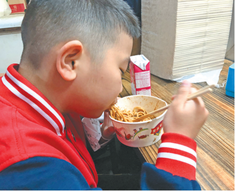 江夏区大花岭街南车花园小区门口的早餐店内,孩子正在吃“小碗面”。长江日报记者刘海锋 摄