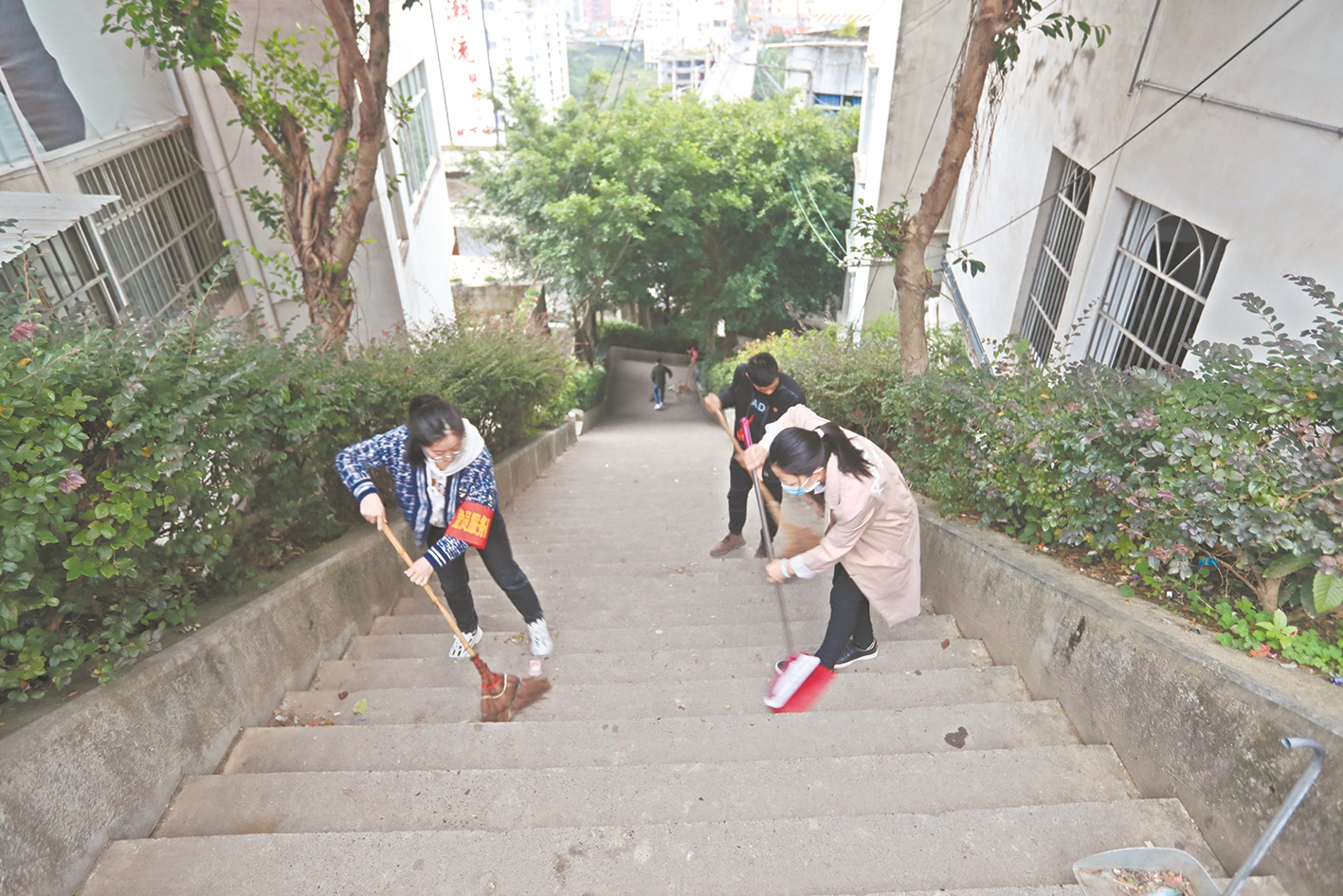 老师们在清扫台阶