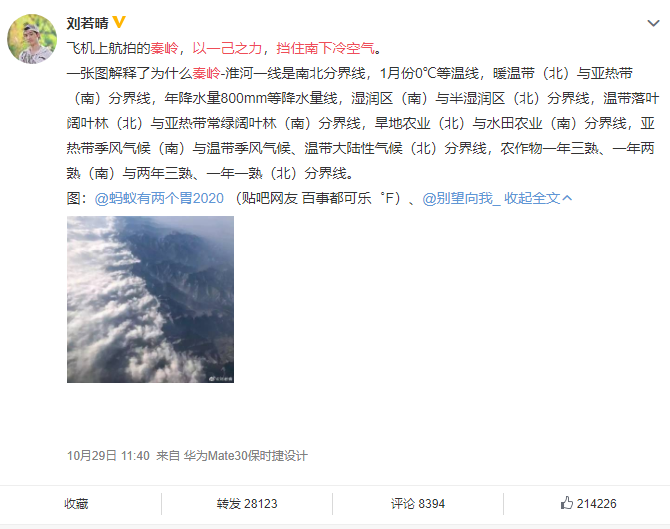 随后@中国天气 发长文进行科普《秦岭,真的能用一己之力挡住南下冷空气?》: