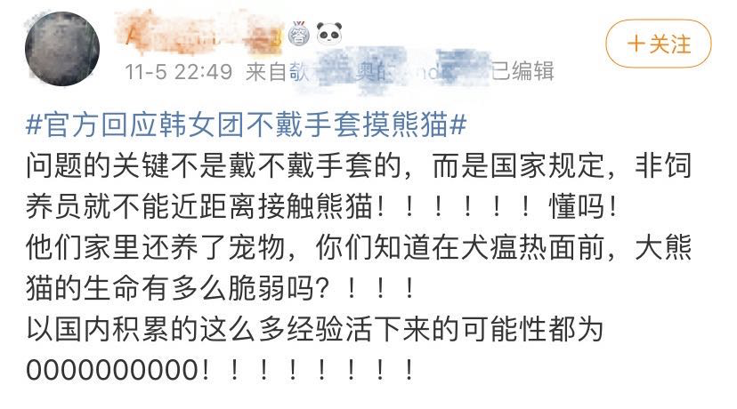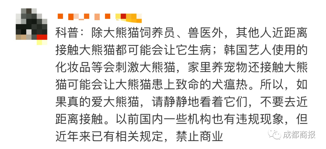 近日,一档韩国综艺节目中,几名艺人带妆拥抱、抚摸“福宝”。该团队中其中一人家中还饲养了其他宠物,节目中甚至出现了成员们不戴口罩、手套触摸成年大熊猫的画面。