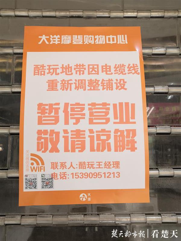4日下午,记者来到位于大洋百货中山店负一层的酷玩地带店铺。见店铺的玻璃门上贴着几张暂停营业的告示,注明暂停营业的原因是“电缆线重新调整铺设”,但没有注明开业的时间。记者拨打告示上留下的电话,对方留下一句“你去问大洋百货吧”,便挂断电话。