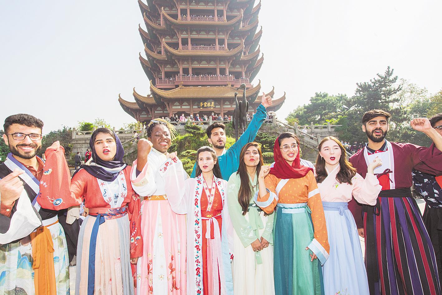 武汉纺织大学的外国留学生身着汉服高呼“我爱中国、我爱武汉”。