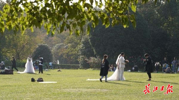 在落雁景区大草坪拍摄婚纱照的恋人。 记者宁秀梅 摄