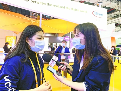 8日,记者占思柳(右)在上海进博会进行现场采访。