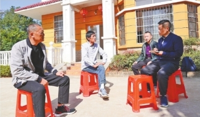 11月18日,江夏区山坡街高峰村村民易学仁(左二)在自家新建楼房前,接受记者(右一)采访。