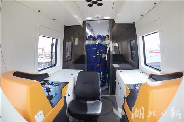 图为:“新时代号”空中轨道列车行驶过程中,驾驶舱内空无一人,技术人员站在驾驶舱门口观察。(湖北日报全媒记者 陈勇 摄)