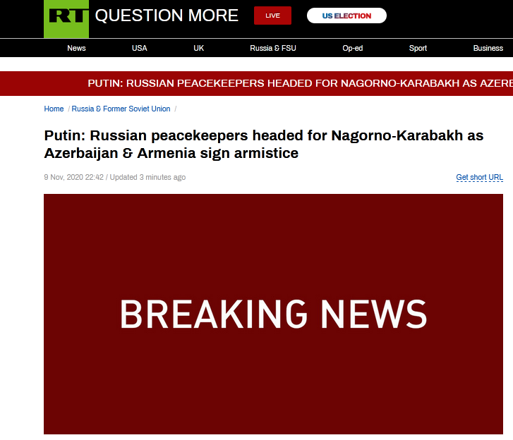 据“今日俄罗斯”(RT)刚刚消息,俄罗斯总统普京表示,在阿塞拜疆与亚美尼亚签署停战协议后,俄罗斯维和部队将前往发生冲突的纳卡地区。