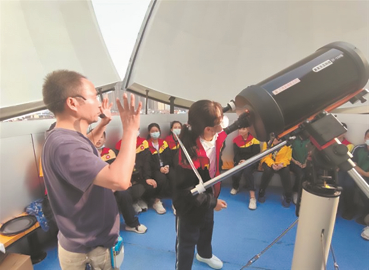 “如果把宇宙比作一个大水池,地球就是其中的一个乒乓球。”武汉市吴家山第二中学天文课老师王伟介绍,天文课既有天文知识讲座,也有实际观测和动手操作等。走进课堂,学生可观看关于天体知识的纪录片。当视频投射到半圆形的立体屏幕时,学生的观影体验变得十分逼真。走出天文活动室,学生们会登上天文台,利用寻星望远镜观察太阳等星体。“其实,天文学对学生综合素质要求很高,既要求学生有广博的知识面,还要有建立在物理、数学、天文学各学科基础上的逻辑推演能力,以及动手观测能力。让学生接触天文课,能激发他们对物理、数学等多学科的学习兴趣。”