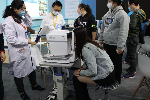 在健康信息管理区摆放着云智能视力健康素养自测机,学生不仅可以进行视力健康知识评测,还可以通过视频或资料自学视力健康知识。在视力健康教育区,播放着视力健康宣教视频,摆放着精心设计的手册、海报、读本等,供参展观众,尤其是学生家长、教师等取阅学习。在视力健康状况监测区,通过云智能视力监测仪可实现高质量学生自主自助式视力检查,检查数据实时上传;通过云智能屈光监测仪,利用人工智能音图交互实现学生自助屈光检查。在眼生理功能运动区,通过以职业荣耀(飞行员、军人等需要眼健康的职业)为主题的互动式视力健康教育科普和素养评估,教授健眼体育运动技能,保护视力“玩起来”。