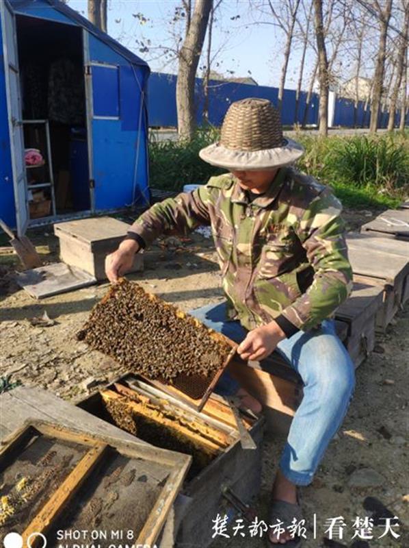 今年34岁石俊,原是一名厨师,因为厌倦厨师的工作,对蜂蜜养殖产生了兴趣,3年前改行养蜂。他常年与其他蜂农们一样“赶花跑”,采一路销一路,因野生蜂蜜质量好,不愁蜂蜜销路,从开始的39箱蜂,繁殖到现在的136箱蜜蜂,是新洲道观河风景区当地的养蜂大户。