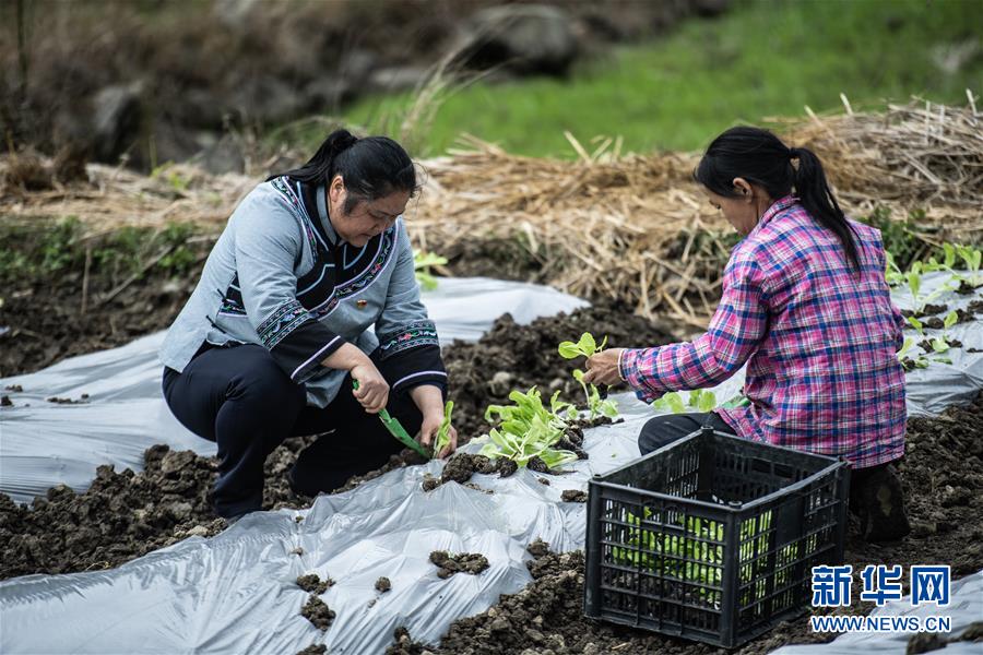 邓迎香(左)在和村民一起种植白菜苗(3月9日摄)。 地处麻山腹地的贵州省罗甸县沫阳镇麻怀村,是一个被群山包围的山地村,也曾是饱受交通不便之苦的极度贫困村。从1999年开始,被称为当代“女愚公”的邓迎香,带领乡亲们经过十余年的艰苦努力,开凿出一条216米长的隧道,将与世阻隔的麻怀村与山外世界连通在一起。如今的麻怀村发展种植养殖、旅游业,产业欣欣向荣。这条连接大山之外的隧道,已成为当地通往幸福的隧道。 新华社记者 陶亮 摄