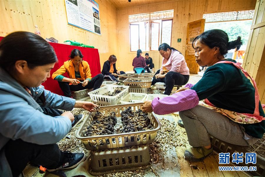 麻怀村村民在给采摘好的黑皮鸡枞菌削根(5月25日摄)。 地处麻山腹地的贵州省罗甸县沫阳镇麻怀村,是一个被群山包围的山地村,也曾是饱受交通不便之苦的极度贫困村。从1999年开始,被称为当代“女愚公”的邓迎香,带领乡亲们经过十余年的艰苦努力,开凿出一条216米长的隧道,将与世阻隔的麻怀村与山外世界连通在一起。如今的麻怀村发展种植养殖、旅游业,产业欣欣向荣。这条连接大山之外的隧道,已成为当地通往幸福的隧道。 新华社记者 陶亮 摄