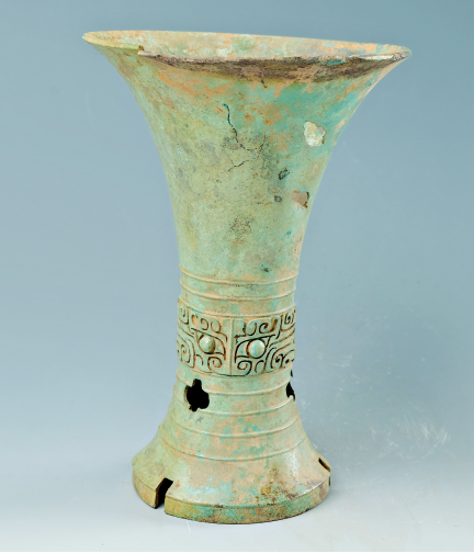 盘龙城王家嘴4号墓出土的商代铜觚。铜觚腰身装饰一周透露着神秘色彩的饕餮纹,流畅的线条配合一双“臣”字形眼更给人一种灵动传神的艺术美感。长江日报记者万建辉 摄