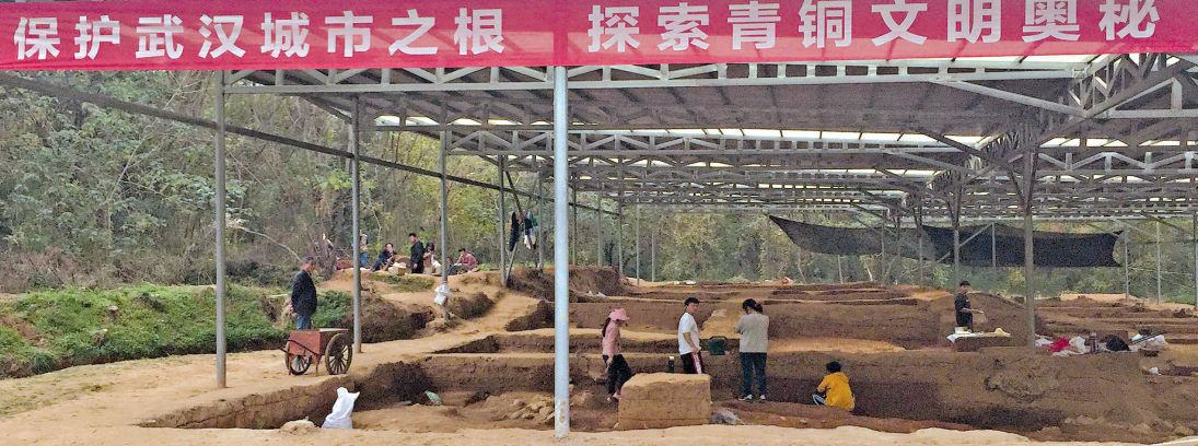 走近盘龙城遗址杨家湾北坡考古遗址点,黄土阡陌状的考古挖掘现场呈现眼前,人工搭起的顶篷上拉着红色横幅:“保护武汉城市之根,探索青铜文明奥秘”。