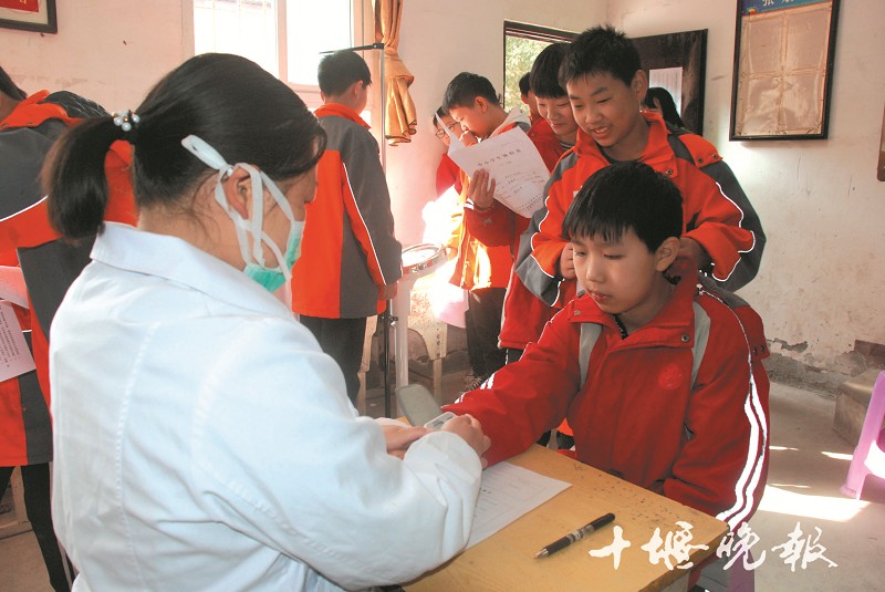 11月12日,郧阳区茶店镇卫生院的医护人员走进茶店镇初级中学,为该校650余名学生进行健康检查。据悉,这样的检查每学年都要进行一次,体检费用全部由政府支出。每次体检结果都将记入学生健康档案。图/通讯员张登卿 李占勇