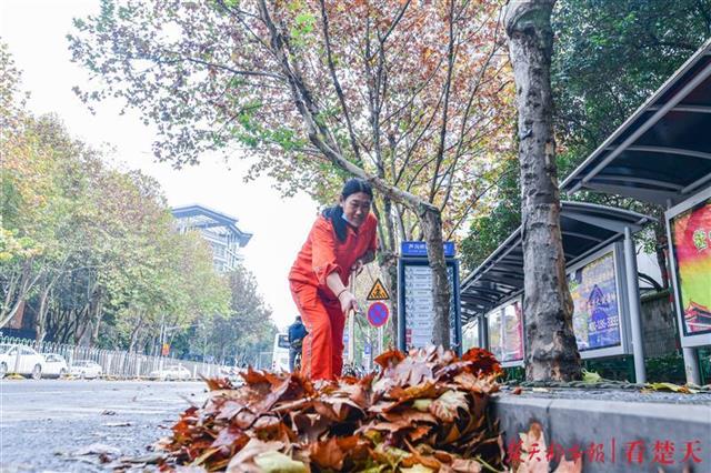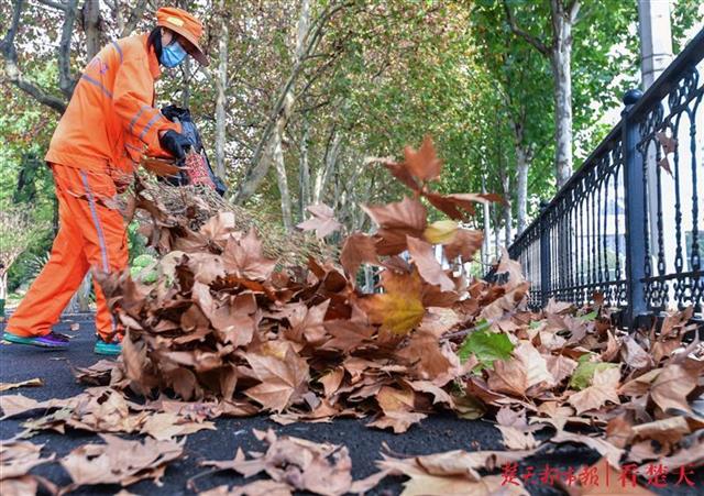 17日,经过一夜风雨,武汉三镇一幅落叶飘飞,金黄满地的景象,又是一年落叶季,江城2万多名环卫工人一年一度的秋季清扫“攻坚战”开始了。