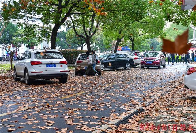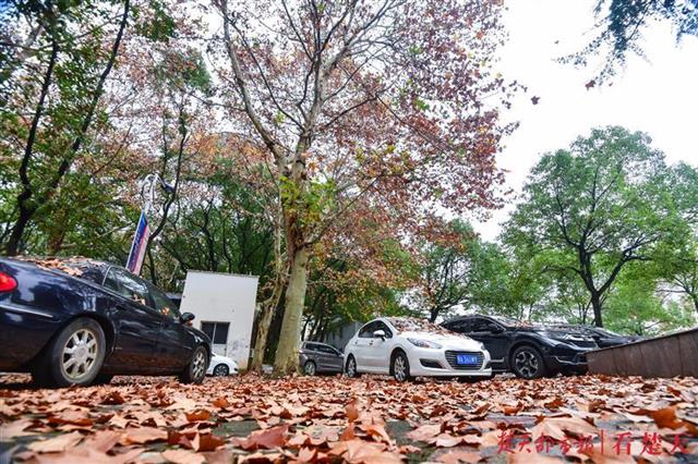 在汉口胜利街一段,半街黄叶,引人来拍秋天的美丽