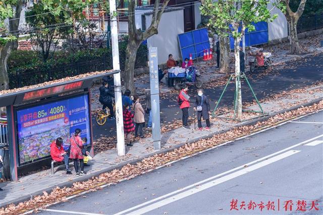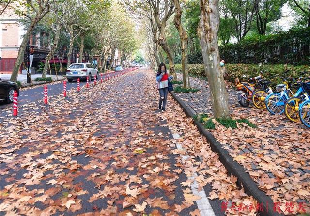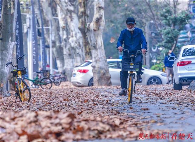 在汉口解放公园路路上,铺了一层梧桐落叶,出行的人们已踩出了一条路