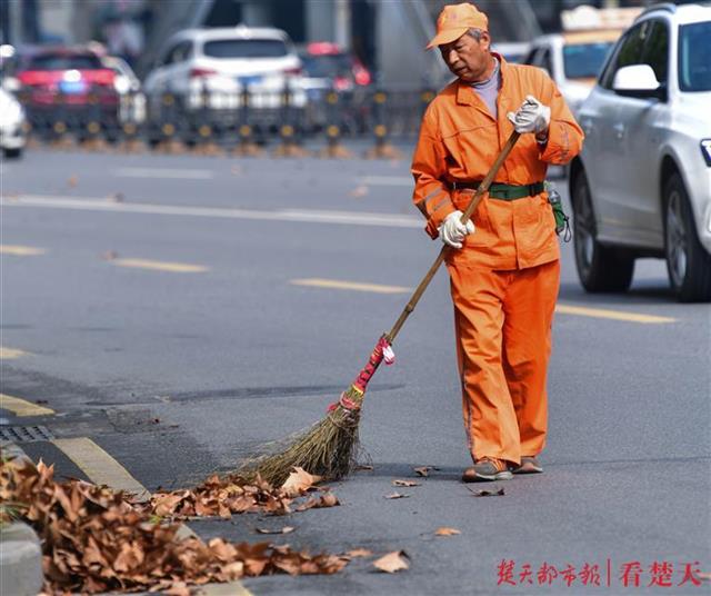 当日,江城秋风欲止又起,梧桐落叶不止,随风飘零。在汉口解放大道,环卫工人艰辛地清扫着道路两边的落叶,但往往是刚清扫完的道路,很快又会满地黄叶,在现场的环卫工林师傅称,在此做环卫多年了,每年到这时都是如此,前面扫干清,后面又来了落叶,路上的落叶被人踩、车辗,如不尽快清扫,就会让道路很难看,为保证道路卫生的干净整洁,他们只能分三班倒不停地清扫,这一点,他们环卫人每年都习惯了。