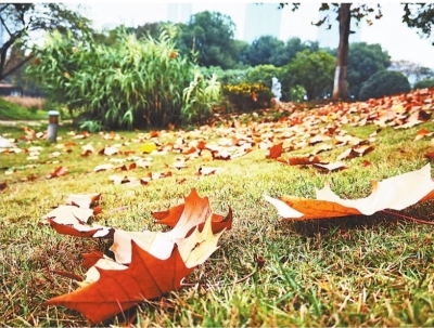 中山公园前区的留春湖面,也飘满法桐落叶,一夜之间仿佛变成了“梧桐湖”。沙湖公园管理处附近的临湖小路,十余株栾树黄叶铺满地面,宛如铺上了一层黄地毯。武昌首义广场,几位市民悠闲地坐在长椅上聊天,背后嫩绿的草坪上,铺满飘落的黄叶,黄绿相映,分外美丽。