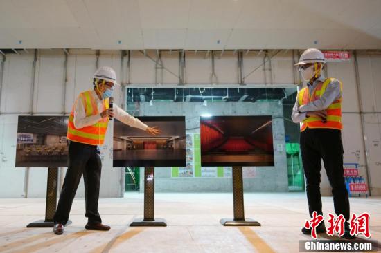 香港故宫文化博物馆设计师严迅奇(左)在博物馆入口大堂介绍大堂和演讲厅的建筑特色。