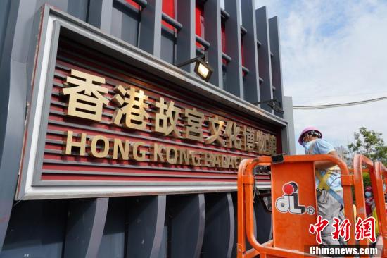 工人在展厅门口安装“香港故宫文化博物馆”的铭牌。