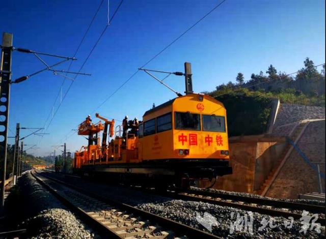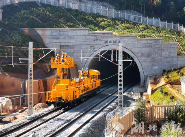 当天的研和站施工现场,一组印着“中国中铁”的黄色作业车在轨道上缓缓前行,在施工负责人董廷超的指挥调度下,机车轰鸣,一根根导线被平稳拉直。
