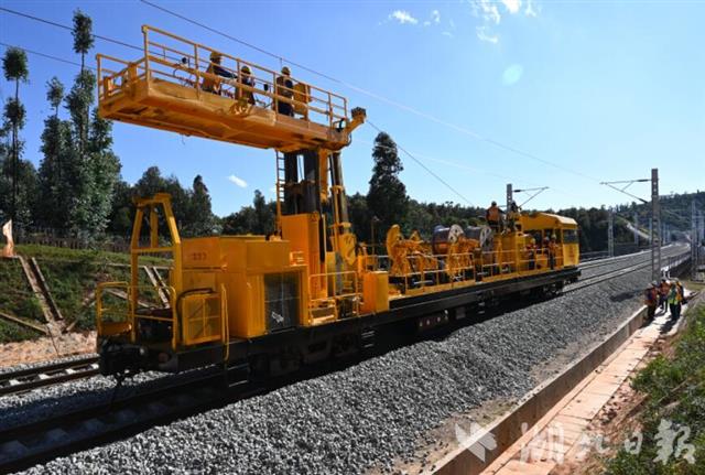 铁路电气化工程涉及电力、牵引供电等方面,是铁路建设“最后一公里”的关键环节,事关车站、列车用电,列车的运行安全和旅客的用电体验。“施工交叉接口多、精度控制难,误差必须控制在毫米级。”中铁武汉电气化局玉磨项目副总工程师赖鹏介绍,为了提升导线的平整性,此次采用轨行恒张力放线作业车进行机械化施工,确保车辆稳定匀速行驶和自动控制架设,提升施工质量、效率。据介绍,中老铁路接触网分为4个区段施工,高峰期上线作业人员到6000多人。