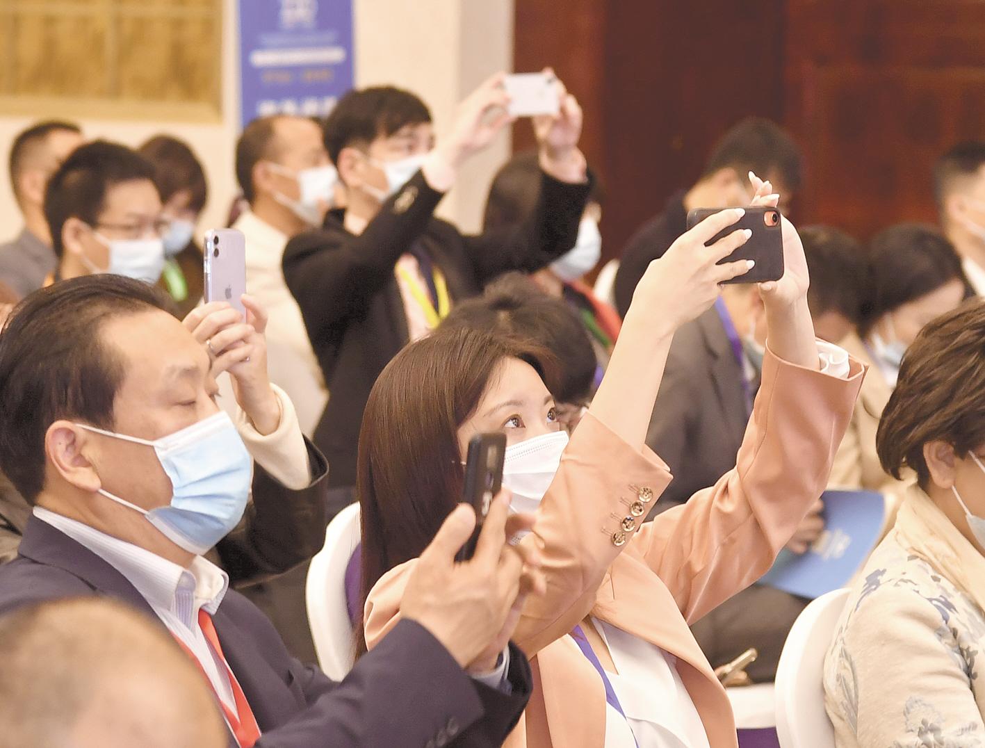 第二十届华创会开幕式现场,海外代表嘉宾拍摄大会盛况。 (湖北日报全媒记者 魏铼 摄)
