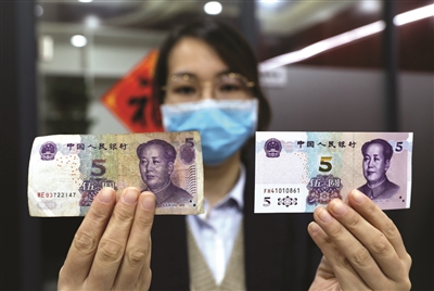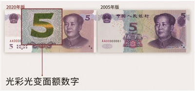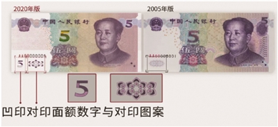 据该行工作人员介绍,2020年版第五套人民币5元纸币保持了2005版第五套人民币5元纸币的规格、主图案、主色调,“中国人民银行”行名、国徽、盲文面额标记、汉语拼音行名、民族文字等要素不变,对票面结构层次与效果等做了一系列优化,提升了整体防伪性能,拥有更高辨识度的色彩、更加精细化的图纹、更先进的防伪设计。