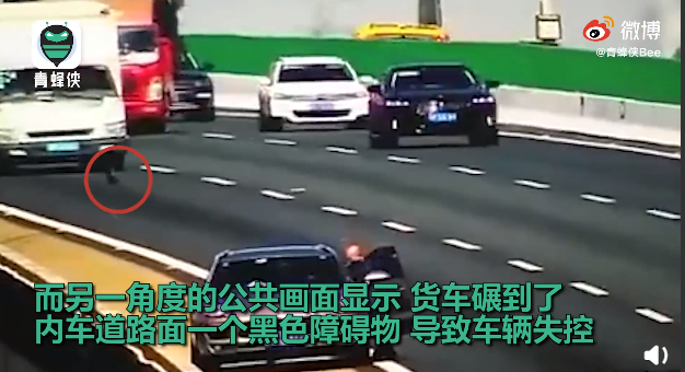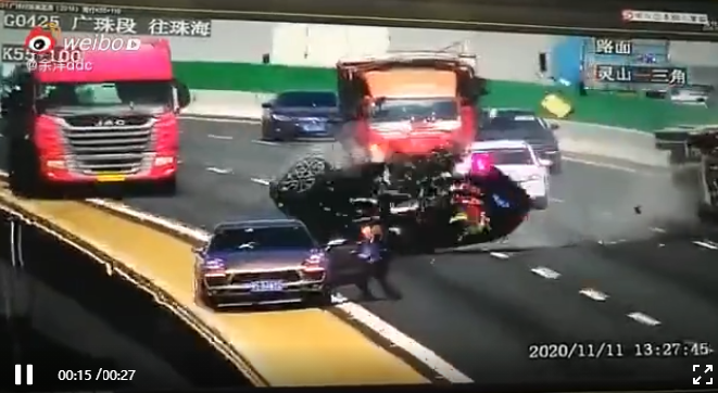 11月11日中午13时30分左右,广澳高速广州往珠海方向k53+700处,一辆白色小货车碰撞路面桥梁伸缩缝后,失控撞向前方正常行驶的蓝色小轿车,造成小轿车从超车道翻滚到应急车道,后从应急车道护栏边上掉落桥下。