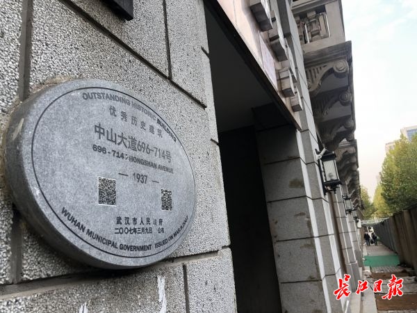 巷道口的一块铭牌显示,临街的西式建筑属于武汉优秀历史建筑。记者扫描铭牌上的二维码,显示出该建筑的基本信息:中山大道696—714号,建于1937年前。
