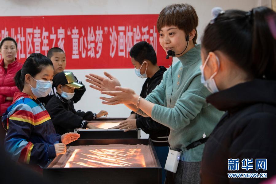 11月15日,在太原市万柏林区前进路北社区,朱霞为孩子们上沙画课。新华社记者 杨晨光 摄