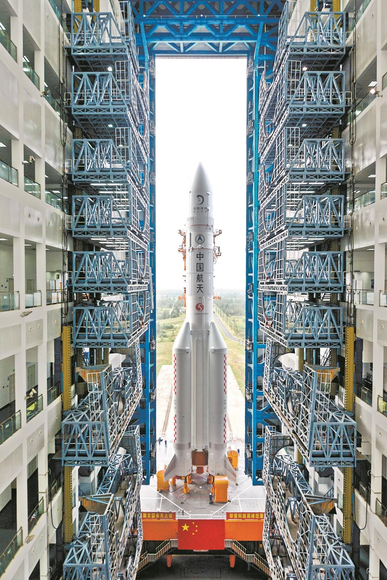 今年9月,长征五号从天津港经海路运达文昌后,进入发射场进行各项测试,并与嫦娥五号对接,如今整装待发。