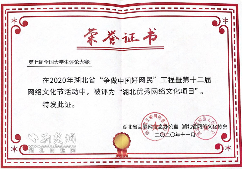 荆楚网承办的第七届全国大学生评论大赛获评2020“湖北优秀网络文化项目”,该赛事是全国最早开始的聚焦大学生群体的全国性评论赛事,在全国大学生群体、新闻媒体业界和学界中享有盛誉,已经成为湖北省舆论引导工作的一张重要的“金名片”。大赛今年有24家全国重点新闻网站协办,北京大学、中国人民大学、武汉大学、华中科技大学、重庆大学等百余所高校重点参与,向全国性的大学生亮点赛事迈进。本届大赛征集作品类型丰富多样,不仅包括文字类评论作品,还包括了漫评、手绘、图解、短视频、音频等多种评论类型,鼓励参赛选手用创意“浇灌”评论沃土,在多元的作品形式中滋养出无限思考。大赛启动5个多月以来,已收到千余篇参赛作品,将于12月中旬举办总决赛,决赛现场将创新形式,“豪华”评委阵容和新锐青年学子将有更精彩的互动,敬请关注。(点击进入第七届全国大学生评论大赛专题)