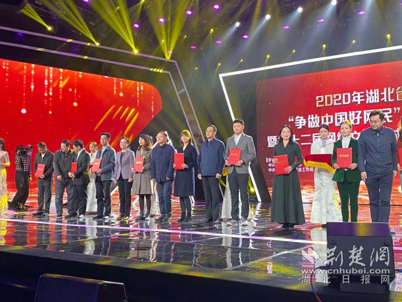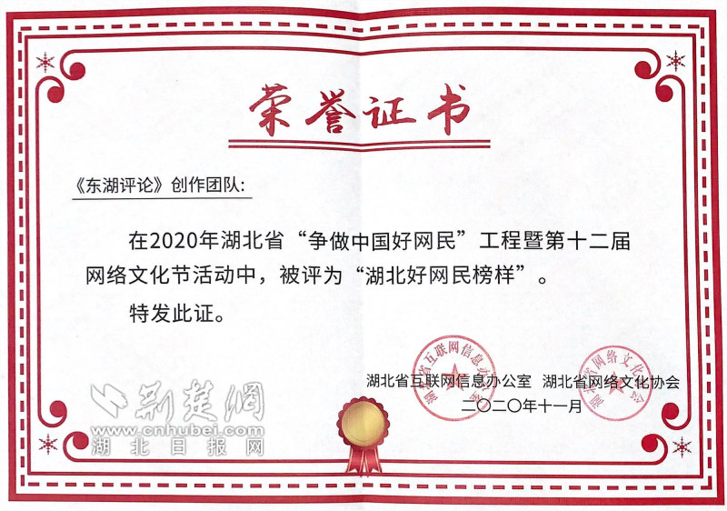 荆楚网客户端-荆楚网消息(记者王舒娴、杨虹磊)11月25日,由湖北省委网信办指导、湖北省网络文化协会举办的2020年湖北省“争做中国好网民”工程暨第十二届网络文化节成果展示活动举行。经组织推荐、网络投票、专家评审、终审评议、公开公示等环节,六大类67个项目或个人获奖,荆楚网《东湖评论》创作团队获评2020“湖北好网民榜样”,第七届全国大学生评论大赛获评2020“湖北优秀网络文化项目”。