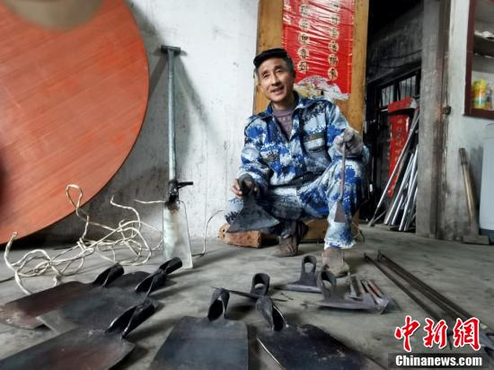 11月25日,在安徽省肥西县铭传乡聚星社区,打铁匠陆玉宝在展示自己的“作品”。陆玉宝从事打铁工作已有30多年,他打制的锄头、刀具,不仅美观而且经久耐用。在现代工业浪潮的冲击下,打铁这个传承了千年的古老行当,逐渐被世人遗忘。据陆玉宝介绍,上世纪九十年代,打铁还是个热门行当,一条街上就有6家打铁铺,如今,整个铭传乡只有他一家打铁铺。