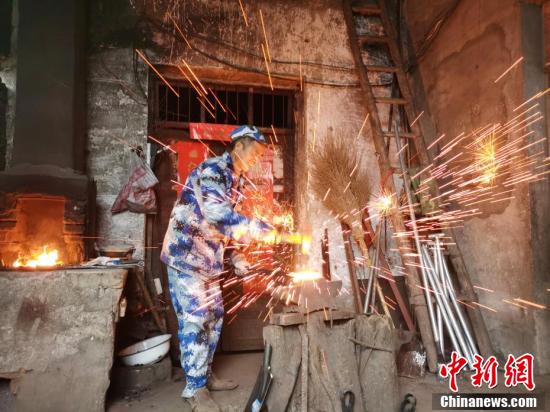 11月25日,在安徽省肥西县铭传乡聚星社区,陆玉宝在自家的打铁铺锻造农具。陆玉宝从事打铁工作已有30多年,他打制的锄头、刀具,不仅美观而且经久耐用。在现代工业浪潮的冲击下,打铁这个传承了千年的古老行当,逐渐被世人遗忘。据陆玉宝介绍,上世纪九十年代,打铁还是个热门行当,一条街上就有6家打铁铺,如今,整个铭传乡只有他一家打铁铺。