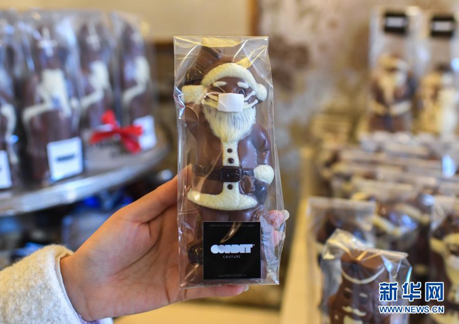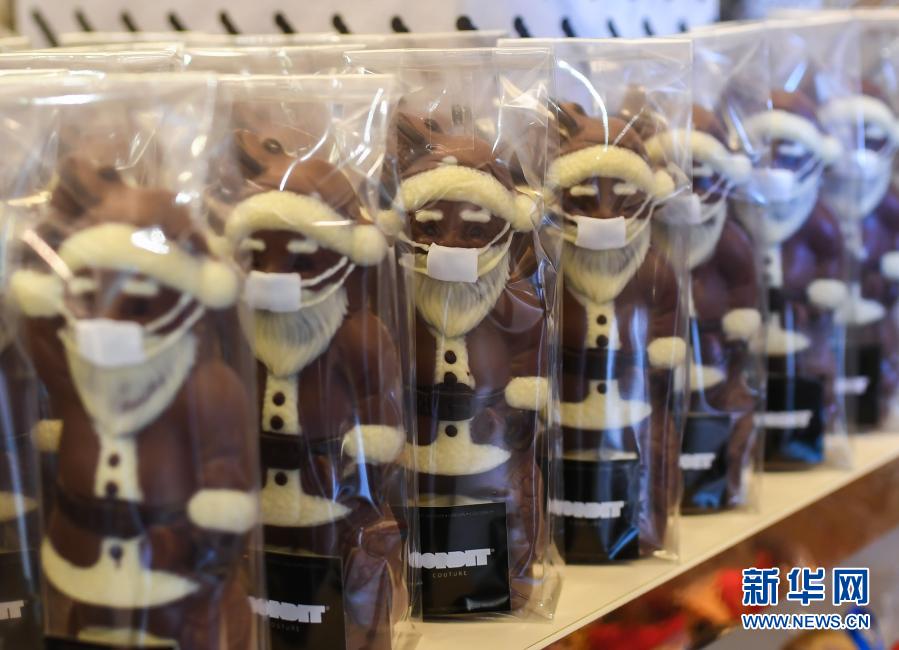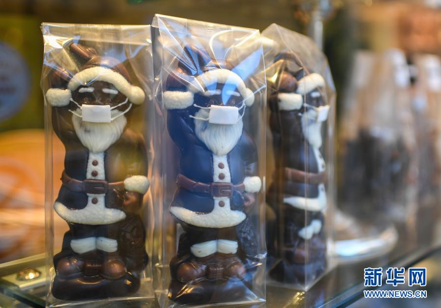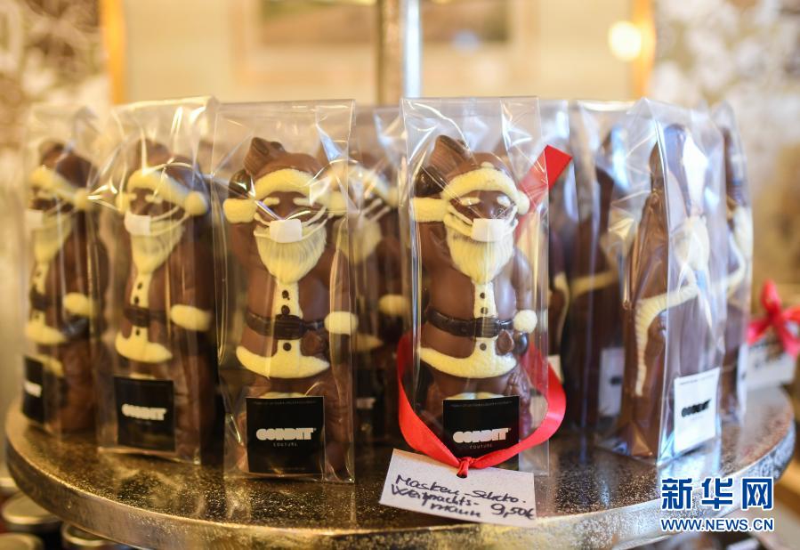 这是11月25日在德国法兰克福一家糕点店内拍摄的戴口罩的圣诞老人造型巧克力。新华社记者逯阳摄