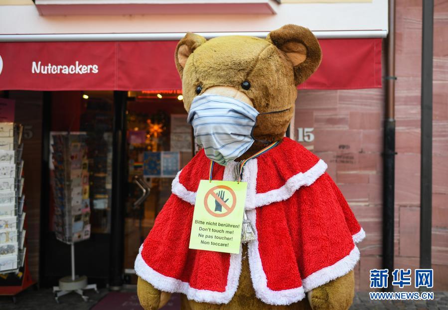 这是11月25日在德国法兰克福一家纪念品商店前拍摄的戴口罩的玩具熊。新华社记者逯阳摄