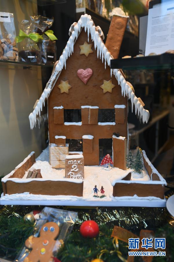 11月25日,德国法兰克福一家糕点店内的姜饼屋旁放着写有“最多允许两人同时入内”的牌子。新华社记者逯阳摄